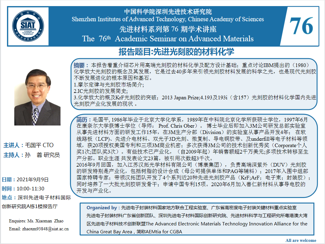 先进材料科学与工程研究所“先进材料系列”第76期学术讲座将于2021年9月9日(周四)10:00-11:30 在深圳先进电子材料国际创新研究院A栋1楼报告厅进行。