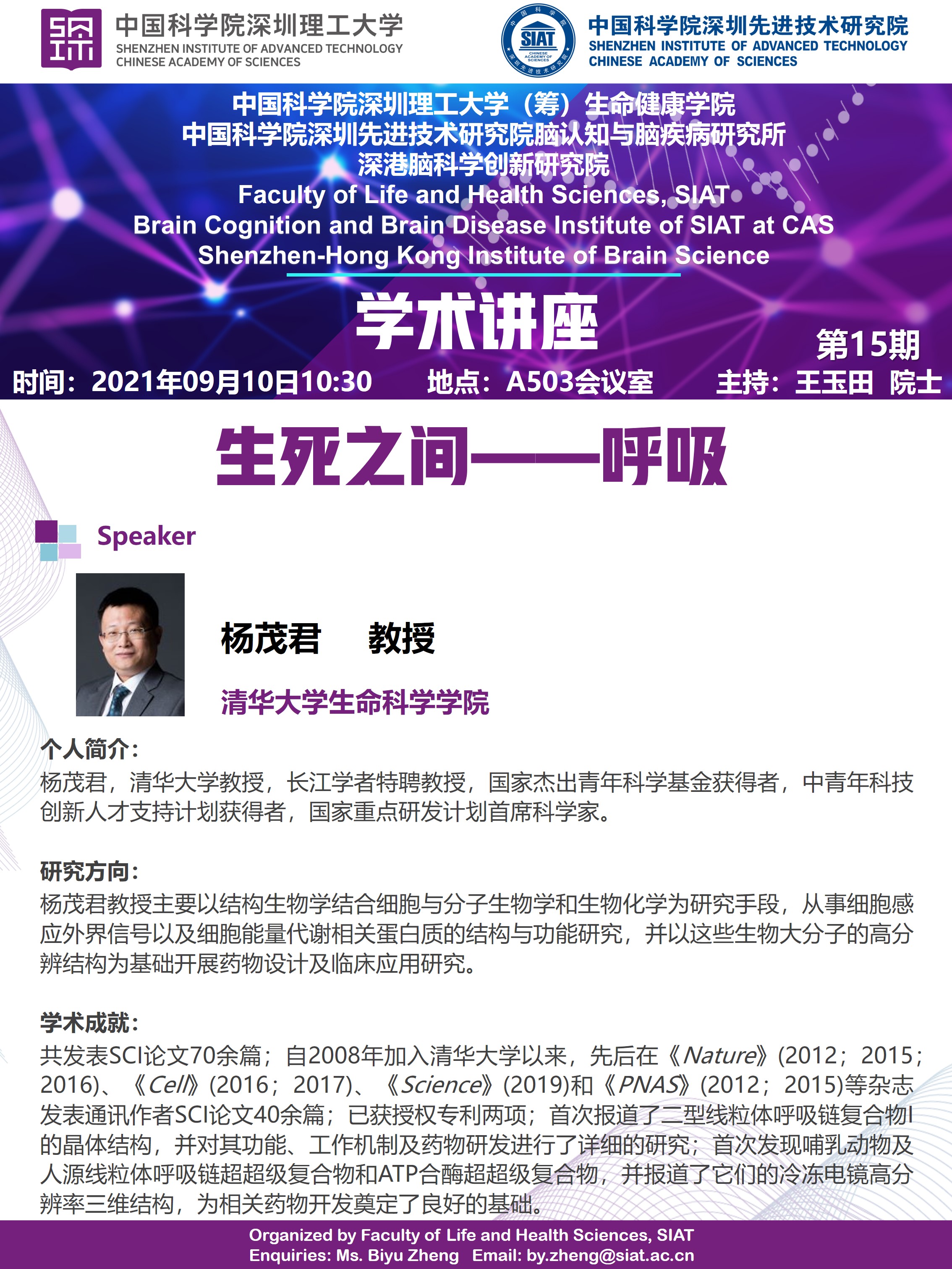生命健康学院、脑所将于2021年09月10日10:30,在A503会议室举办第十五期学术讲座。清华大学,杨茂君教授将带来“生死之间——呼吸”专题讲座。