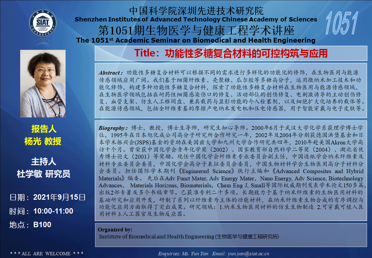 大家好!医工所将于2021年9月15日(周三)10:00-11:00,在B100会议室举办第1051期生物医学与健康工程学术讲座,特邀 华中科技大学 杨光教授 作题为“功能性多糖复合材料的可控构筑与应用”的学术报告。诚挚邀请大家参加学习和交流!