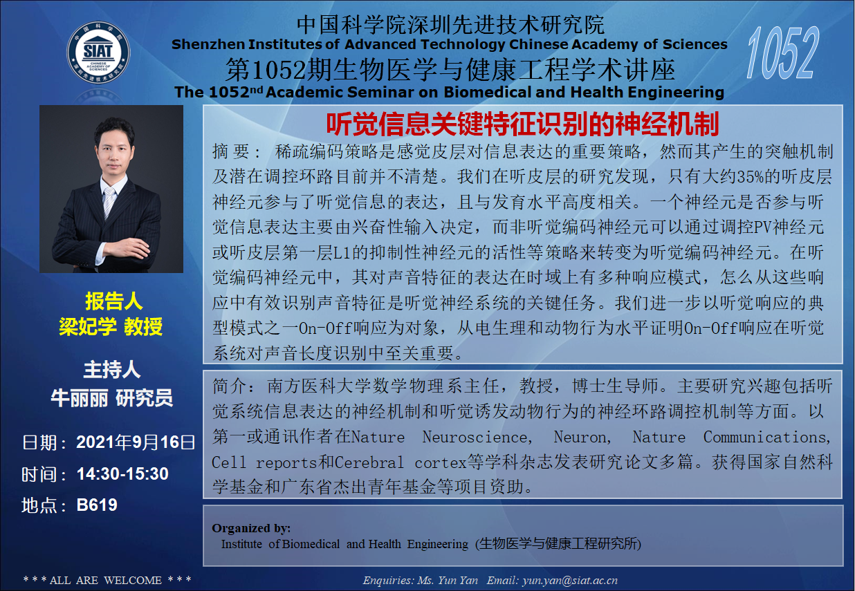 大家好!医工所将于2021年9月16日(周四)14:30-15:30,在B619会议室举办第1052期生物医学与健康工程学术讲座,特邀 南方医科大学 梁妃学 教授 作题为“听觉信息关键特征识别的神经机制”的学术报告。诚挚邀请大家参加学习和交流!