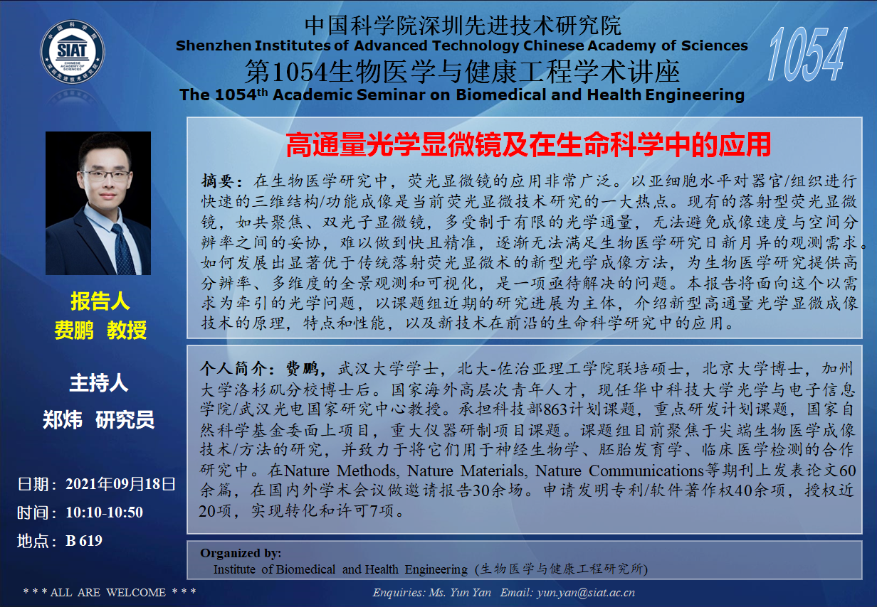 大家好!医工所将于2021年9月18日(周六)10:10-10:50,在B619会议室举办第1054期生物医学与健康工程学术讲座,特邀 华中科技大学 费鹏 教授 作题为“高通量光学显微镜及在生命科学中的应用”的学术报告。诚挚邀请大家参加学习和交流!