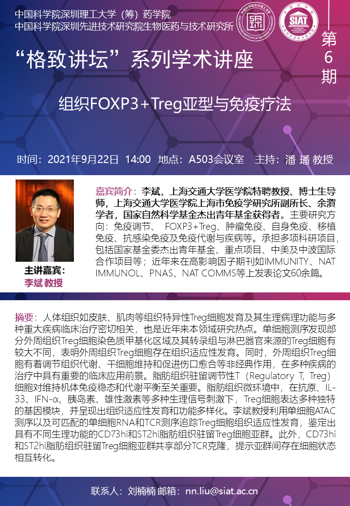 大家好!药学院/医药所“格致讲坛”系列学术讲座第6期来啦!“格致讲坛”系列学术讲座第6期将于2021年9月22日(周三)14:00在先进院A503会议室举行。本次讲座邀请了来自上海交通大学的李斌教授带来“组织FOXP3+Treg亚型与免疫疗法”的报告。届时,潘璠教授将主持讲座。