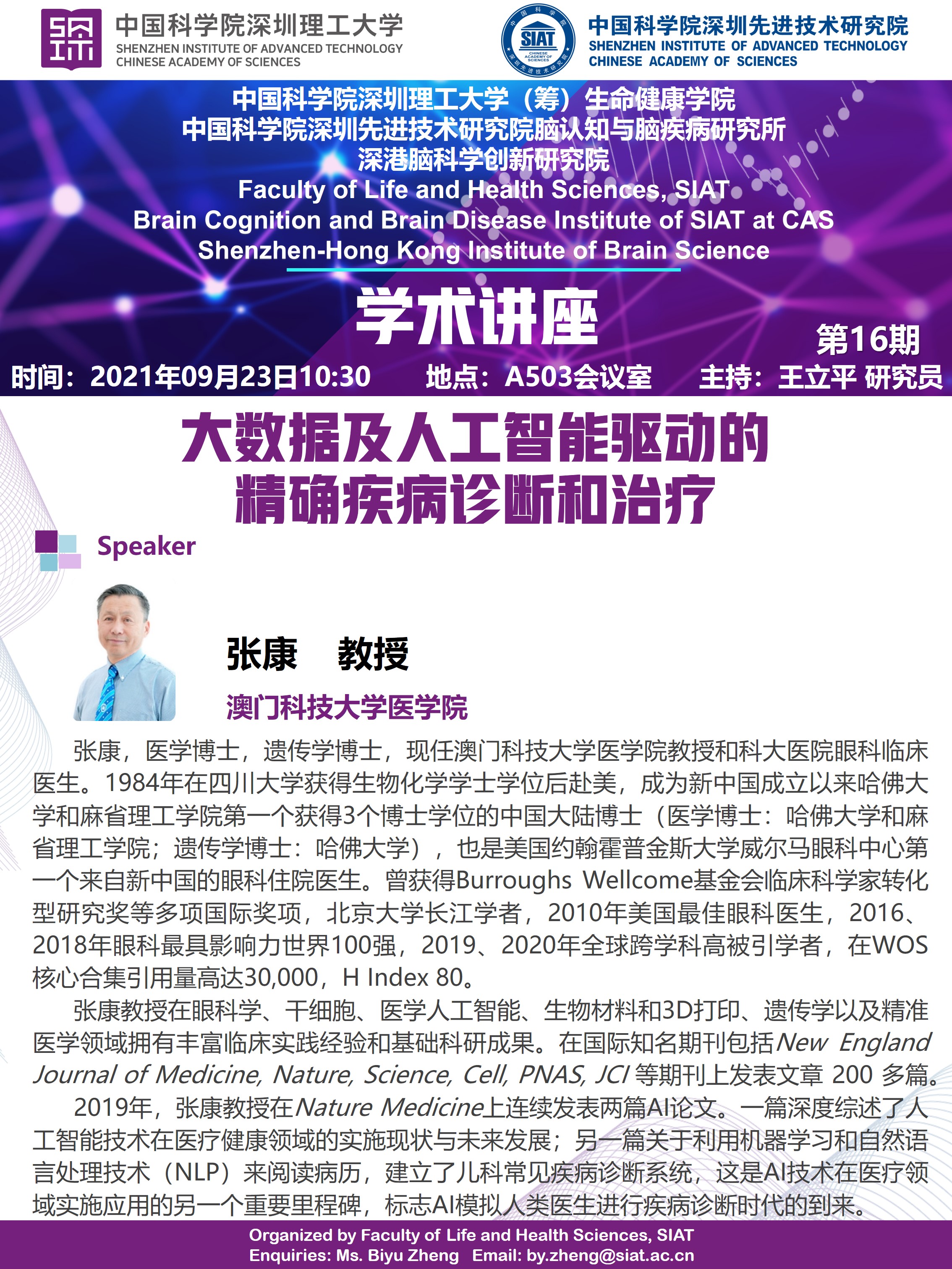 生命健康学院、脑所将于2021年09月23日10:30,在A503会议室举办第十六期学术讲座。澳门科技大学医学院,张康教授将带来“大数据及人工智能驱动的精确疾病诊断和治疗”专题讲座。