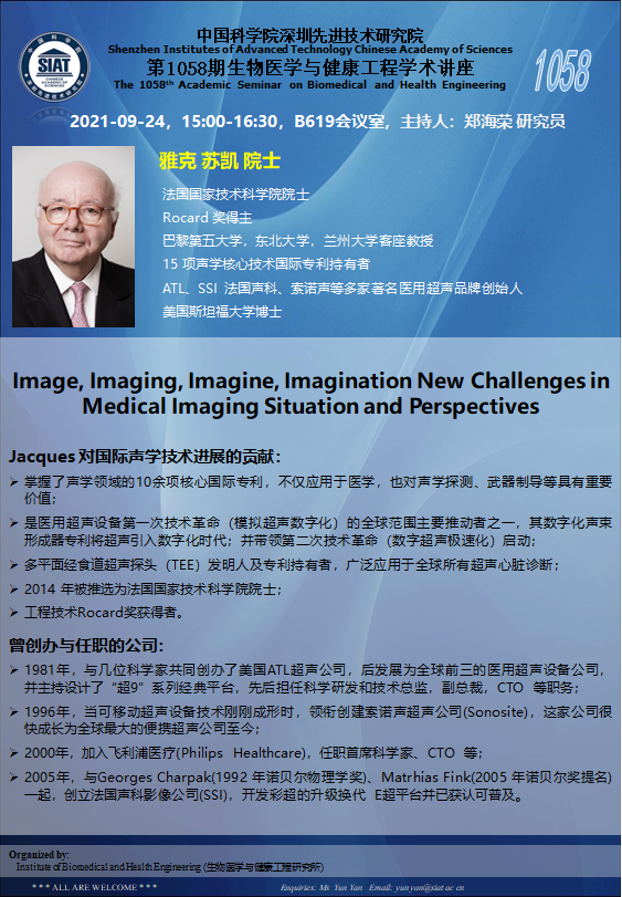 大家好!医工所将于2021年9月24日(周五)15:00-16:30,在B619会议室举办第1058期生物医学与健康工程学术讲座,特邀 雅克·苏凯 法国国家技术科学院院士 作题为“Image, Imaging, Imagine, Imagination New Challenges in Medical Imaging Situation and Perspectives”的学术报告。诚挚邀请大家参加学习和交流!