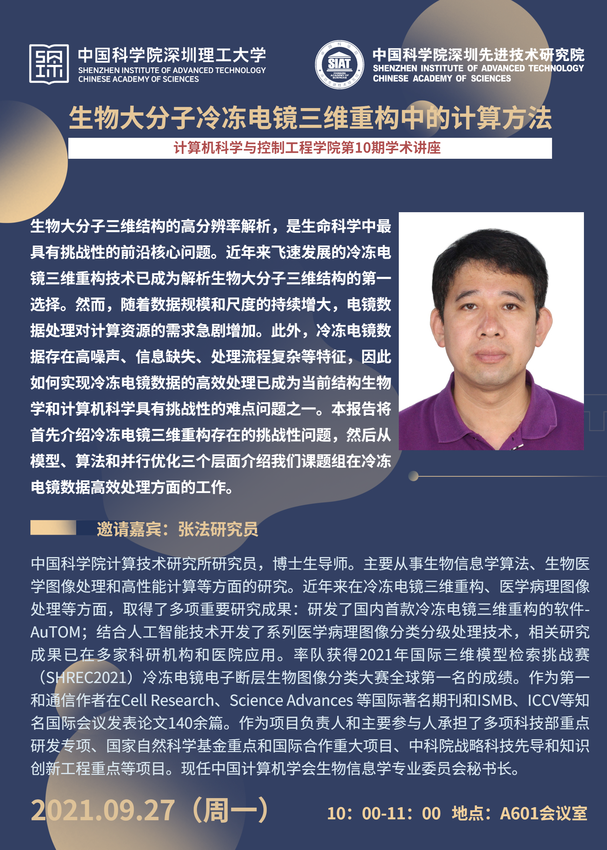 大家好!深理工计算机科学与控制工程学院,第10期学术讲座将于9月27日10:00-11:00在A601会议室举行,本次讲座将邀请中国科学院计算技术研究所张法研究员进行题为“生物大分子冷冻电镜三维重构中的计算方法”的报告。诚挚邀请大家参加、学习和交流!