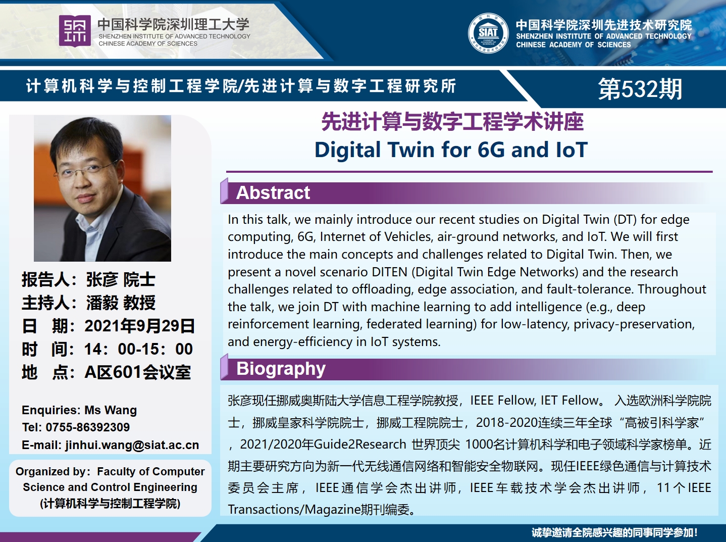 【2021年9月29日 数字所/深理工计算机科学与控制工程学院】Digital Twin for 6G and IoT