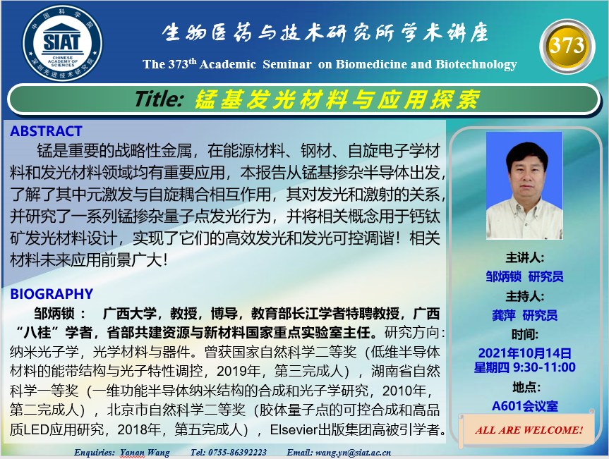 医药所第373期学术讲座将于2021年10月14日 星期四 9:30-11:00在先进院 A601会议室举行。本次讲座邀请了来自广西大学,邹炳锁 研究员带来“锰基发光材料与应用探索”的报告。届时,龚萍 研究员将主持讲座。
