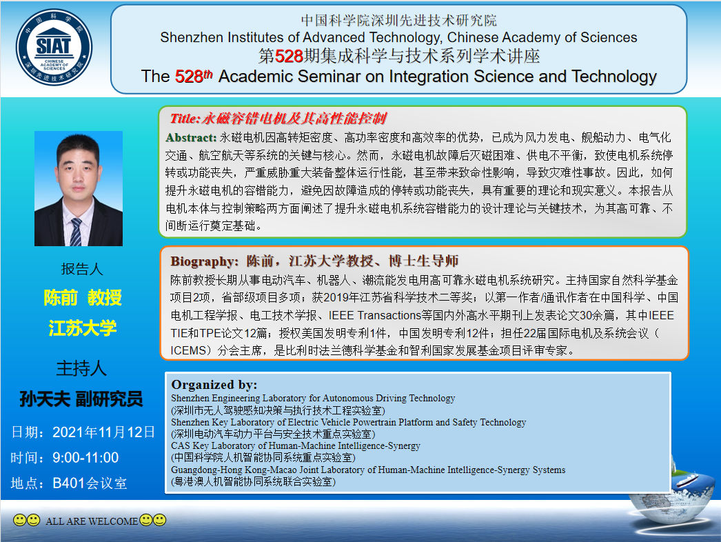 集成所第528期集成科学与技术系列学术讲座将于11月12日(周五)上午9:00-11:00在B401会议室召开。本次讲座特邀江苏大学的陈前 教授作题为《永磁容错电机及其高性能控制》的学术报告。