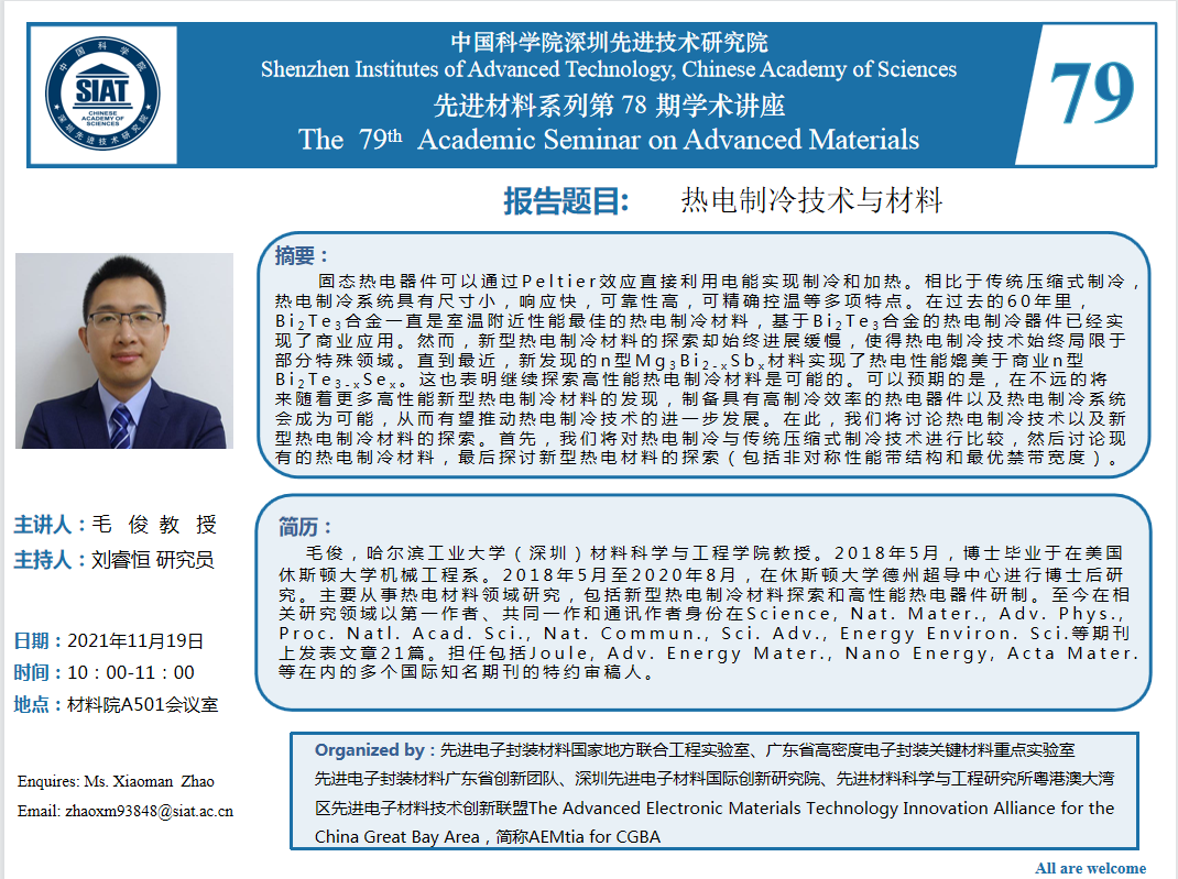 【2021年11月19日 先进材料科学与工程研究所】热电制冷技术与材料