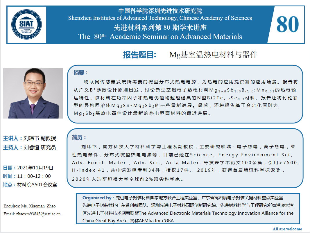 【2021年11月19日 先进材料科学与工程研究所】Mg基室温热电材料与器件