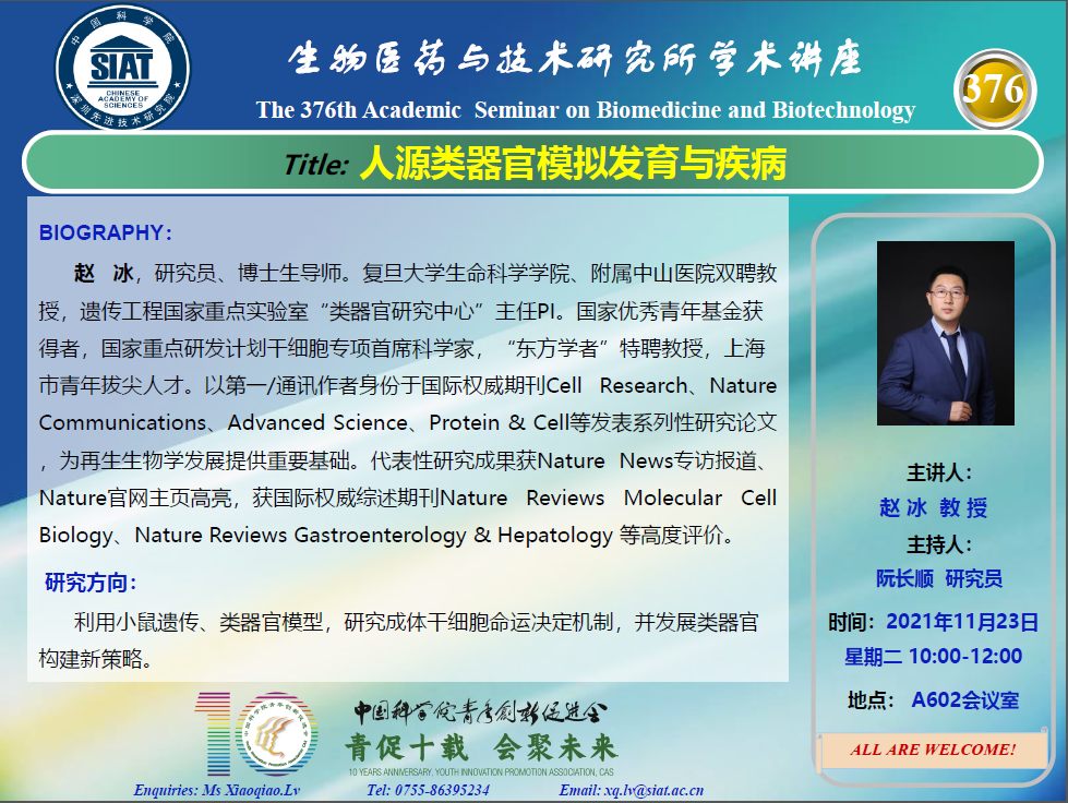 医药所第376期学术讲座将于2021年11月23日 星期二 10:00-12:00在先进院 A602会议室举行。本次讲座邀请了来自复旦大学生命科学学院,赵 冰 教授带来“人源类器官模拟发育与疾病”的报告。届时,阮长顺 研究员将主持讲座。