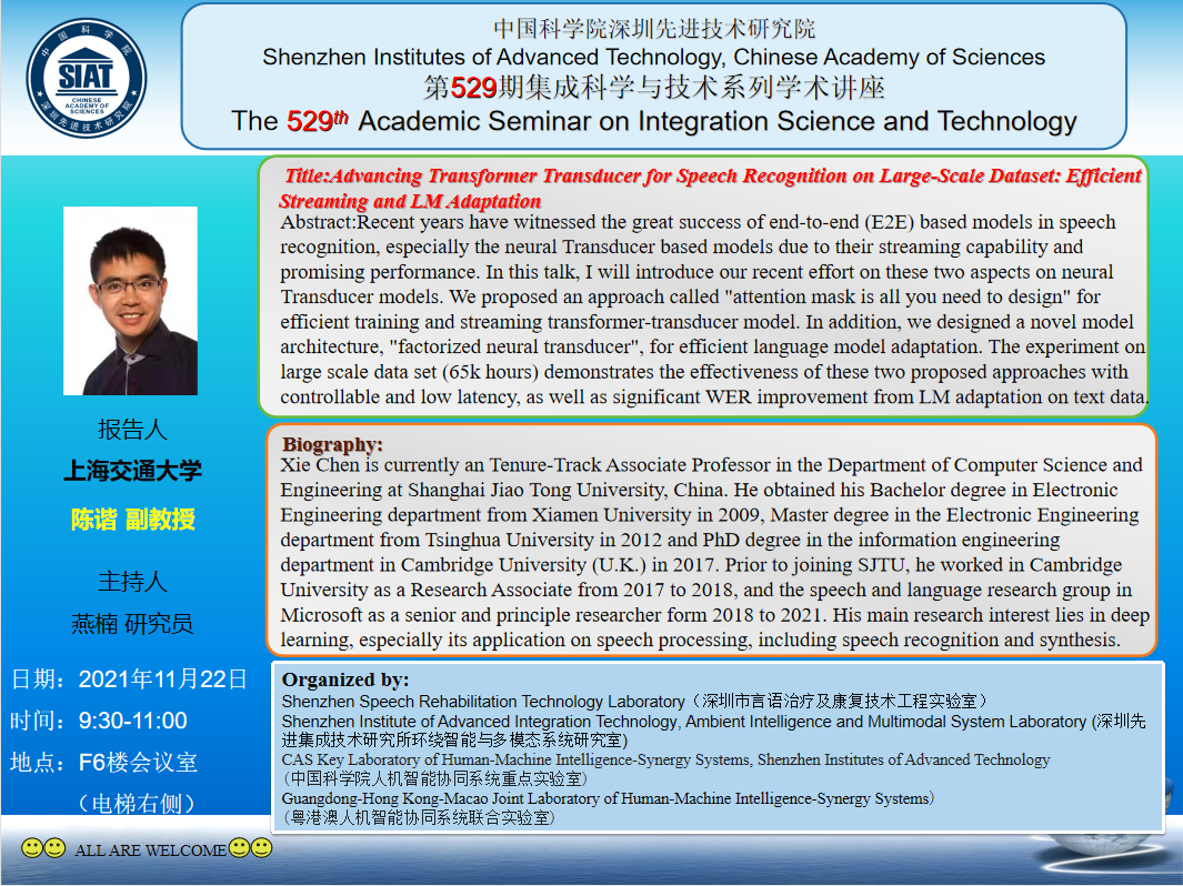集成所第529期集成科学与技术系列学术讲座将于11月22日(下周一)上午9:30-11:00在F6楼会议室召开。本次讲座特邀上海交通大学的陈谐 副教授