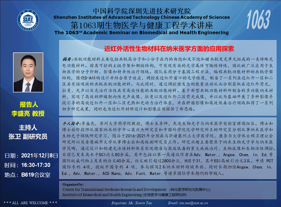 大家好!医工所将于2021年12月8日(周三)16:30-17:30,在B619会议室举办第1063期生物医学与健康工程学术讲座,特邀李盛亮 苏州大学药学院教授 作题为“近红外活性生物材料在纳米医学方面的应用探索”的学术报告。诚挚邀请大家参加学习和交流!