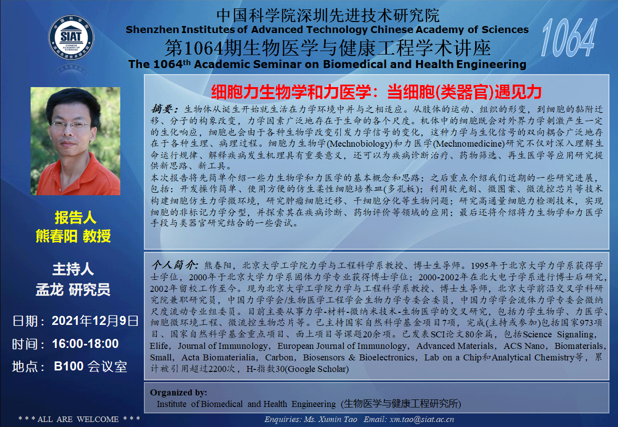 大家好!医工所将于2021年12月9日(周四)16:00-18:00,在B100 会议室举办第1064期生物医学与健康工程学术讲座,特邀熊春阳 北京大学工学院力学与工程科学系教授 作题为“细胞力生物学和力医学:当细胞(类器官)遇见力”的学术报告。诚挚邀请大家参加学习和交流!
