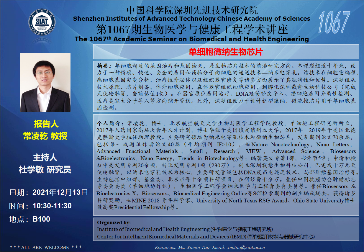 大家好!医工所将于2021年12月13日(周一)10:30-11:30,在线上B100会议室举办第1067期生物医学与健康工程学术讲座,特邀常凌乾 北京航空航天大学生物与医学工程学院教授 作题为“单细胞微纳生物芯片”的学术报告。诚挚邀请大家参加学习和交流!
