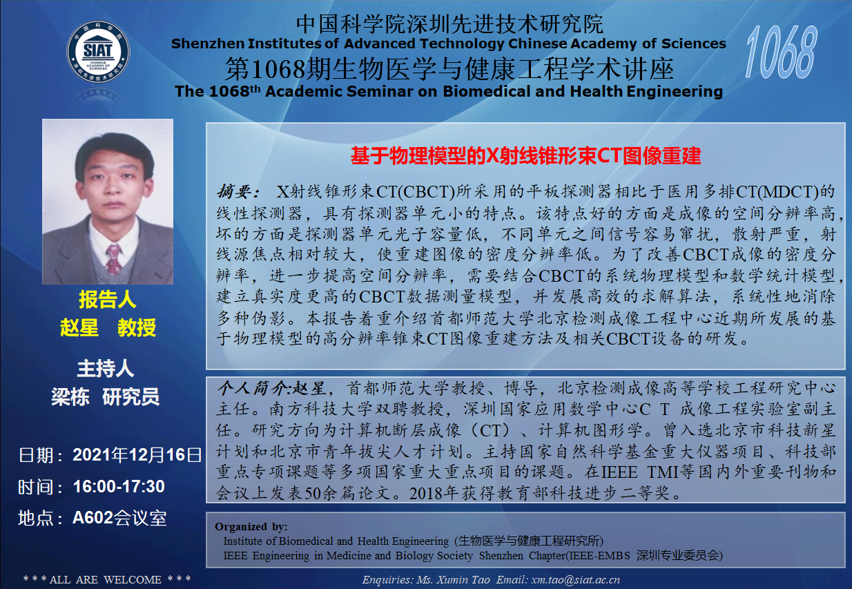 大家好!医工所将于2021年12月16日(今天)16:00-17:30在A602会议室举办第1068期生物医学与健康工程学术讲座,特邀 赵星 首都师范大学教授 作题为“基于物理模型的X射线锥形束CT图像重建”的学术报告。诚挚邀请大家参加学习和交流!
