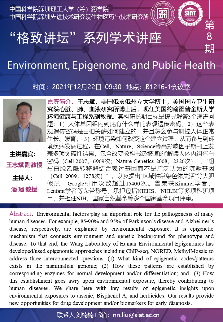 大家好!药学院/医药所“格致讲坛”系列学术讲座第8期将于2021年12月22日(周三)09:30,在先进院B1216-1会议室举行。本次讲座邀请了来自美国约翰霍普金斯大学的王志斌副教授带来“Environment, Epigenome, and Public Health”的报告。届时,潘璠教授将主持讲座。