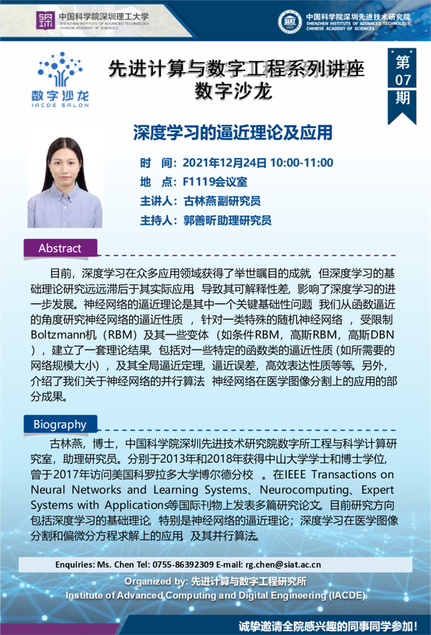 各位老师、同学: 大家好!“数字沙龙”活动第7期将于2021年12月24日(星期五)10:00-11:00,在F1119会议室举行。本期活动由数字所 古林燕 副研究员作题为“深度学习的逼近理论及应用”的报告,报告将从函数逼近的角度研究神经网络的逼近性质等。本次报告将由数字所郭善昕 助理研究员主持,诚挚邀请大家参加、学习和交流!