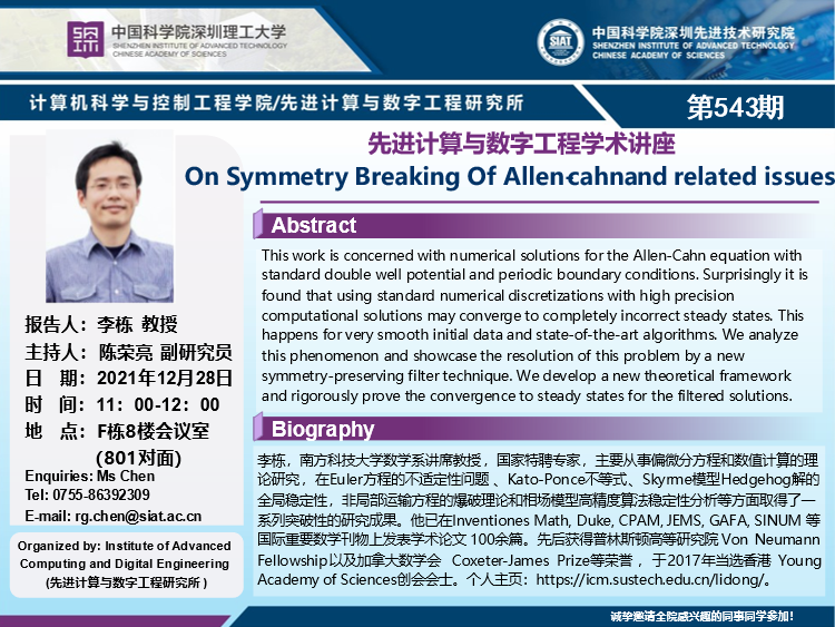 大家好!先进计算与数字工程研究所/计算机学院学术讲座第543期将于12月28日(星期二)11:00-12:00在F栋8楼会议室(801对面)举行,本次讲座将邀请南方科技大学数学系 李栋 教授作题为“On Symmetry Breaking Of Allen-cahnand related issues”的报告。本次报告将由数字所 陈荣亮 副研究员主持,诚挚邀请大家参加、学习和交流!