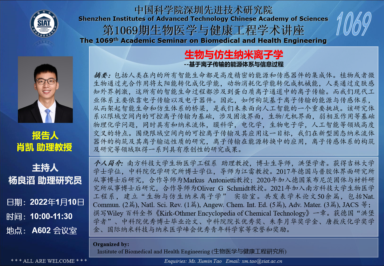 大家好!医工所将于2022年1月10日(周一)上午10:00-11:30,在A602 会议室举办第1069期生物医学与健康工程学术讲座,特邀肖凯 南方科技大学助理教授 作题为“生物与仿生纳米离子学--基于离子传输的能源体系与信息过程”的学术报告。诚挚邀请大家参加学习和交流!