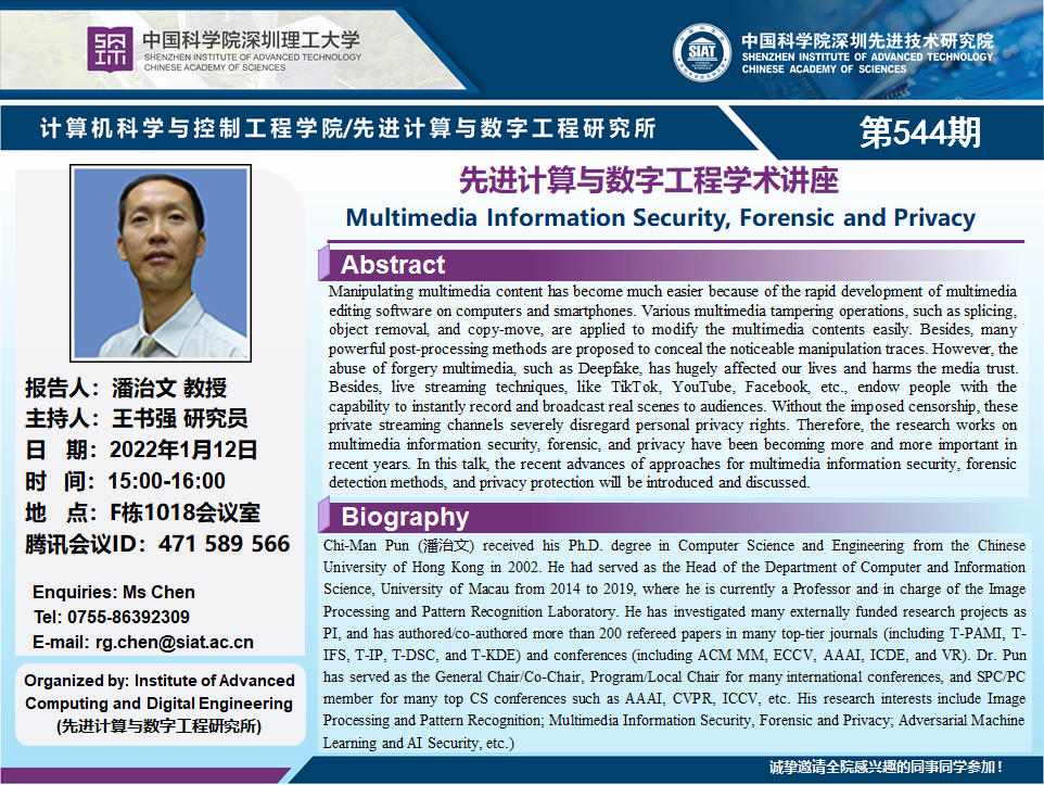 【2022年1月12日 先进计算与数字工程研究所/计算机学院】Multimedia Information Security, Forensic and Privacy