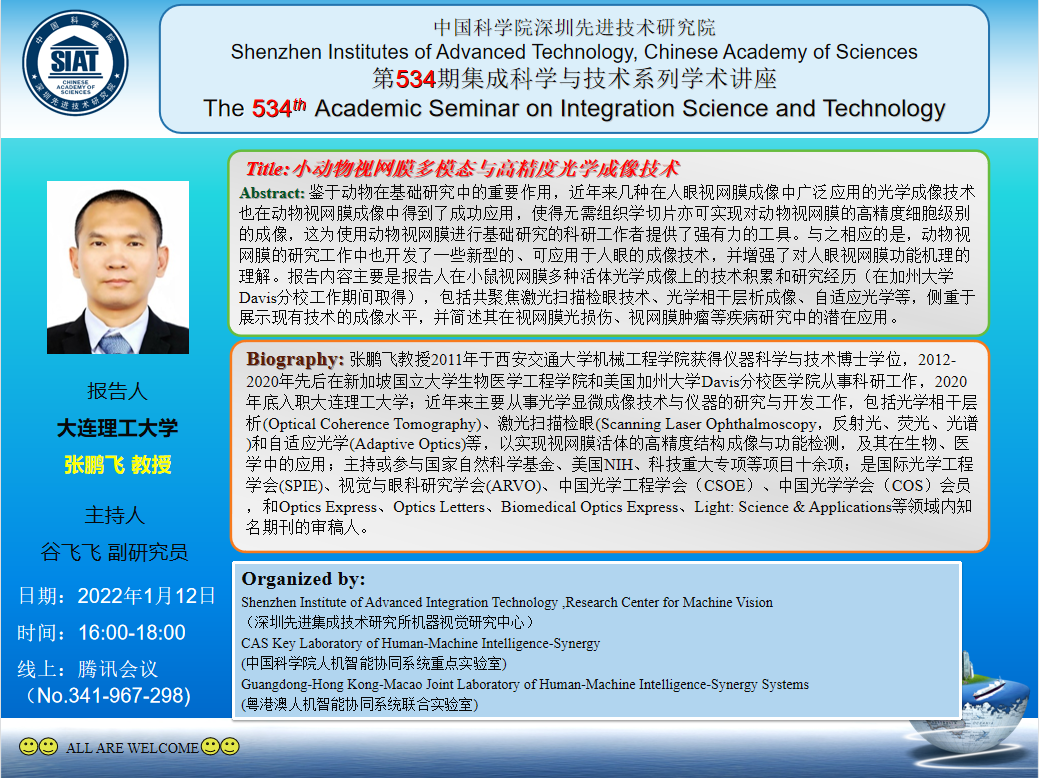 集成所第534期集成科学与技术系列学术讲座将于1月12日(周三)下午16:00-18:00在腾讯会议召开,会议号:341-967-298。本次讲座特邀大连理工大学的张鹏飞 教授作题为《小动物视网膜多模态与高精度光学成像技术》的学术报告。