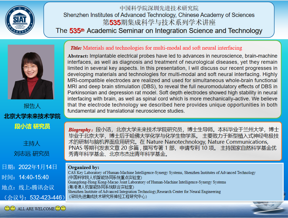 集成所第535期集成科学与技术系列学术讲座将于1月14日(周五)下午14:40-15:40在腾讯会议召开,会议号:532-423-446。本次讲座特邀北京大学未来技术学院的段小洁 研究员作题为《Materials and technologies for multi-modal and soft neural interfacing》的学术报告。