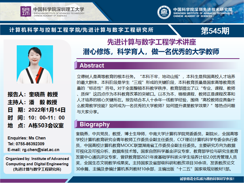 大家好!先进计算与数字工程研究所/计算机学院学术讲座第545期将于1月14日(星期五)10:00-11:00在A栋503会议室举行,本次讲座将邀请中南大学 奎晓燕 教授作题为“潜心修炼,科学育人,做一名优秀的大学教师”的报告。本次报告将由计算机学院 潘毅 教授主持,诚挚邀请大家参加、学习和交流!