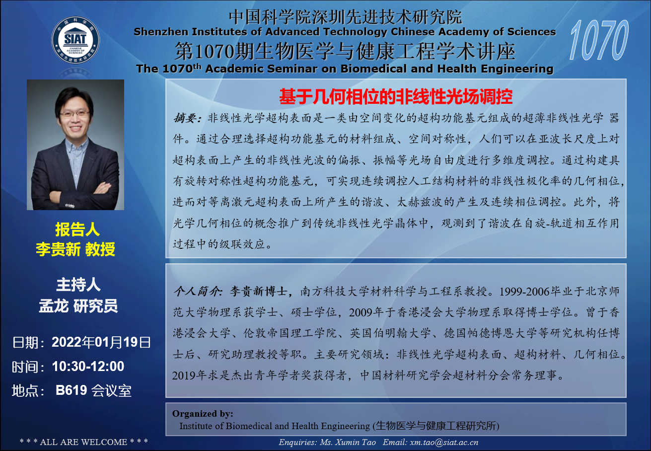 大家好!医工所将于2022年01月19日(周三)10:30-12:00,在B619 会议室举办第1070期生物医学与健康工程学术讲座,特邀李贵新 南方科技大学教授 作题为“基于几何相位的非线性光场调控”的学术报告。诚挚邀请大家参加学习和交流!