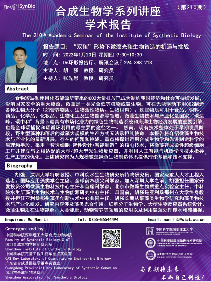 合成所/合成生物学院第210期学术讲座将于 1月20日(周四) 9:30-10:30 在 D6环形报告厅 进行,腾讯会议:294 388 213。