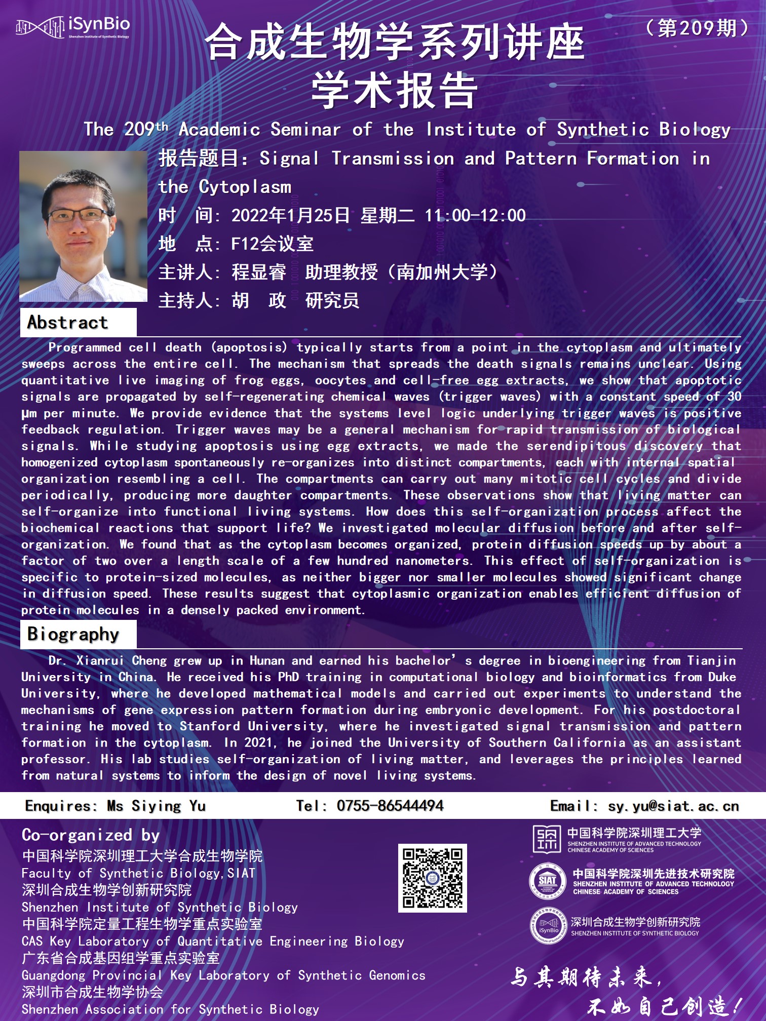 合成所/合成生物学院第209期学术讲座将于 1月25日(周二) 11:00-12:00 在 F12会议室 进行。