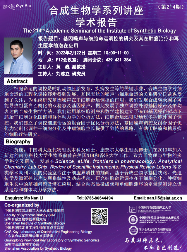 合成所/合成生物学院第214期学术讲座将于 2月22日(周二) 10:00-11:00 在 F12会议室 进行,腾讯会议:439 431 384。