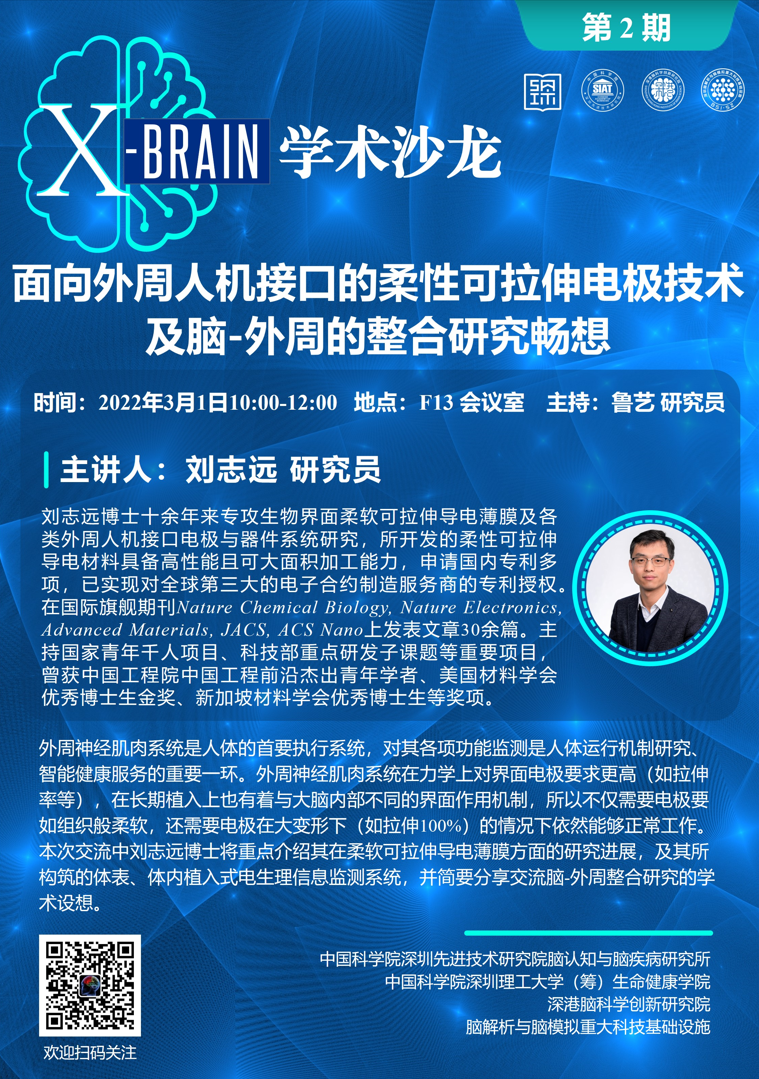 本次沙龙由集成所,刘志远研究员,作题为“面向外周人机接口的柔性可拉伸电极技术及脑-外周的整合研究畅想”的专题报告。