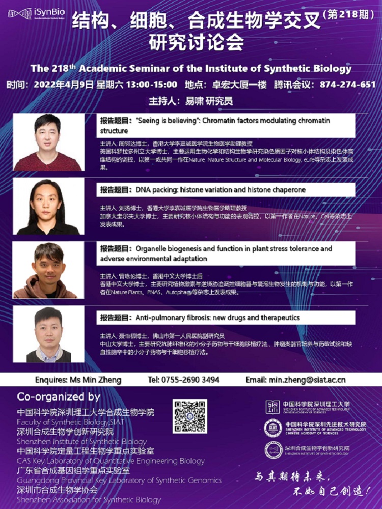 合成所/合成生物学院第218期学术讲座暨结构、细胞、合成生物学交叉研究讨论会将于 2022年4月9日(周六) 13:00-15:00 在 卓宏大厦一楼 举行(腾讯会议:874-274-651)。