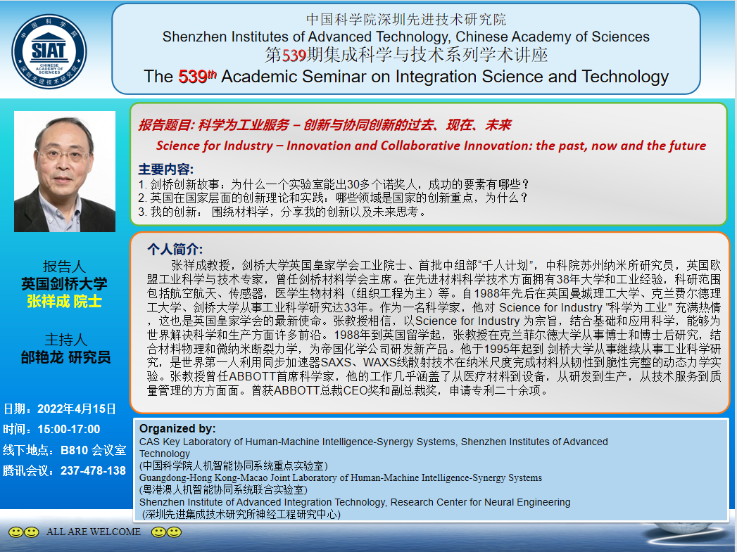集成所第539期集成科学与技术系列学术讲座将于4月15日(周五)下午15:00-17:00线下在B810会议室召开,线上会议号:237-478-138。本次讲座特邀英国剑桥大学的张祥成 院士作题为《科学为工业服务:创新与协同创新的过去、现在、未来》的学术报告。 会议由神经工程研究中心的邰艳龙 研究员主持,诚挚邀请大家准时参加、学习和交流!