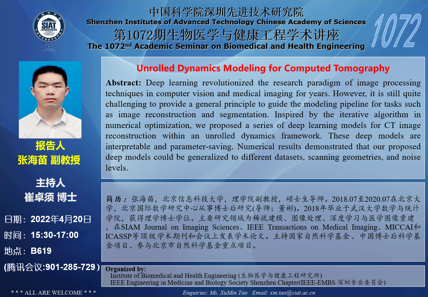 大家好!医工所将于2022年4月20日(周三)15:30-17:00,在B619(腾讯会议:901-285-729)举办第1072期生物医学与健康工程学术讲座,特邀张海苗,北京信息科技大学,理学院副教授 作题为“Unrolled Dynamics Modeling for Computed Tomography”的学术报告。诚挚邀请大家参加学习和交流!