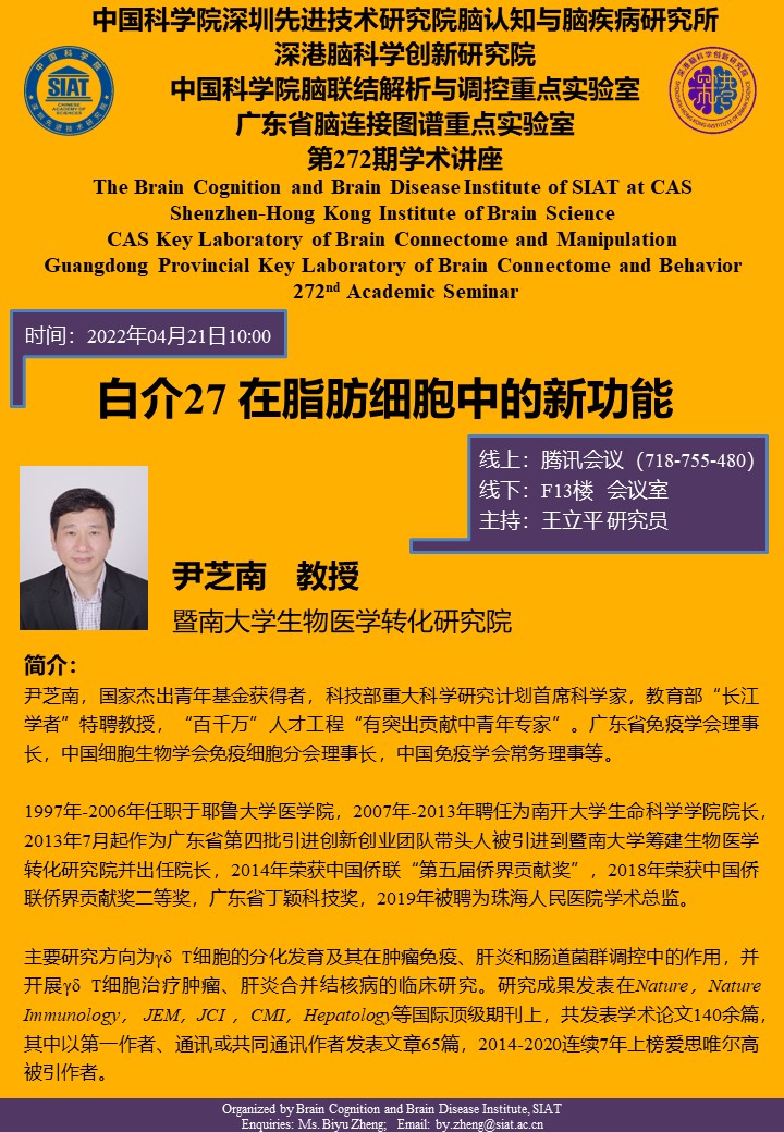 本次讲座由暨南大学生物医学转化研究院,尹芝南教授,作题为“白介27 在脂肪细胞中的新功能”的专题报告。