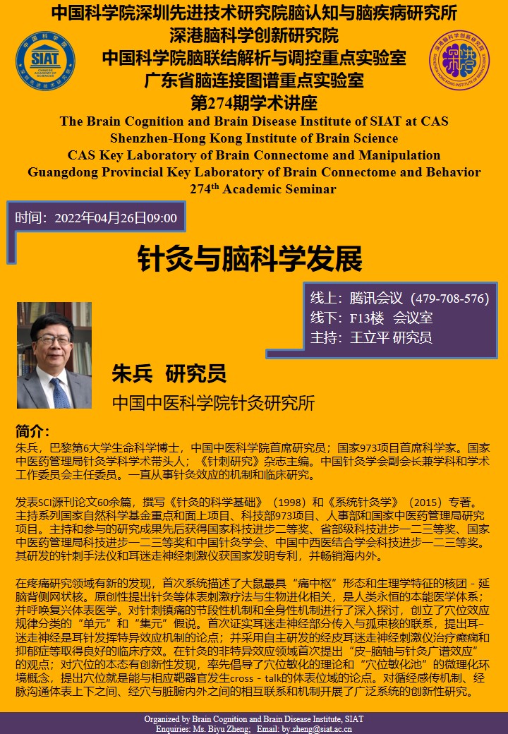 本次讲座由中国中医科学院针灸研究所,朱兵研究员,作题为“针灸与脑科学发展”的专题报告。