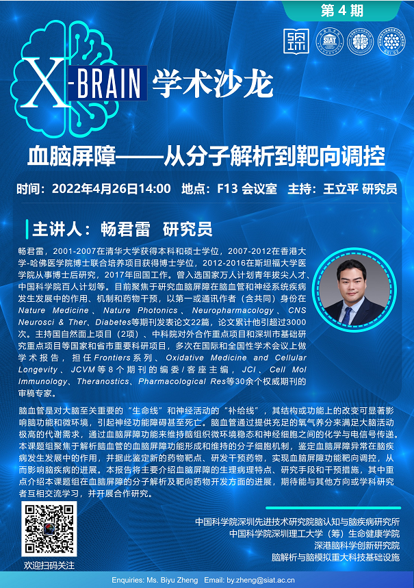 【2022年4月26日 脑认知与脑疾病研究所】第4期X-Brain学术沙龙“血脑屏障——从分子解析到靶向调控”