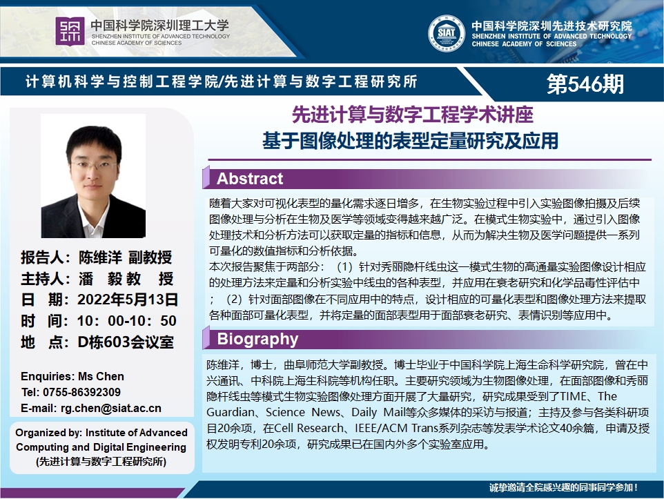大家好!先进计算与数字工程研究所/计算机学院学术讲座第546期将于5月13日(星期五)10:00-10:50在D栋603会议室举行,本次讲座将邀请曲阜师范大学 陈维洋 副教授作题为“基于图像处理的表型定量研究及应用”的报告。本次报告将由计算机学院 潘毅 教授主持,诚挚邀请大家参加、学习和交流!