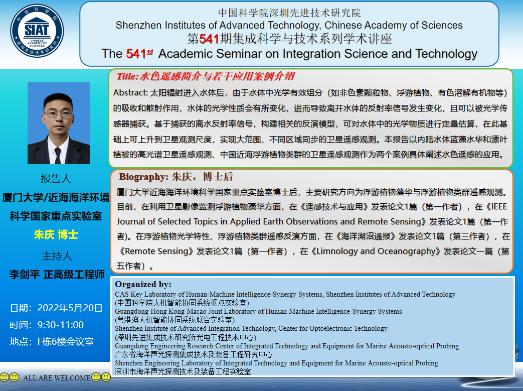 集成所第541期集成科学与技术系列学术讲座将于5月20日(周五)上午9:30-11:00在F栋6楼会议室召开。本次讲座特邀厦门大学的朱庆 博士作题为《水色遥感简介与若干应用案例介绍》的学术报告。
