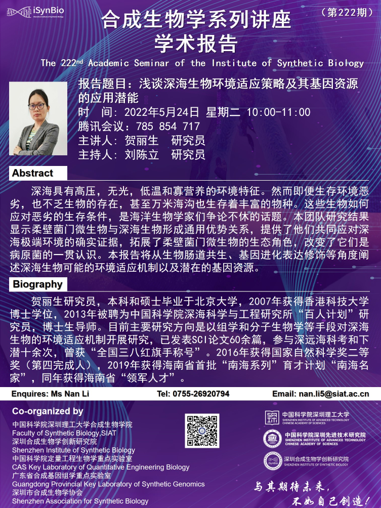 合成所/合成生物学院第222期学术讲座将于 5月24日(周二) 10:00-11:00 举行,腾讯会议:785 854 717。