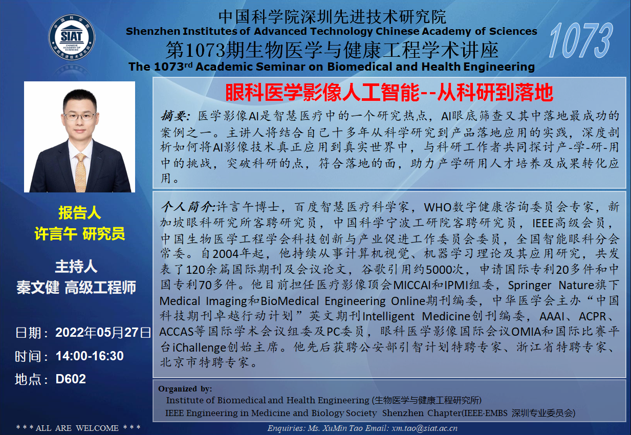 大家好!医工所将于 2022年05月27日 14:00-16:30 在D602举办第1072期生物医学与健康工程学术讲座,特邀许言午博士,百度智慧医疗科学家 作题为“眼科医学影像人工智能--从科研到落地”的学术报告。诚挚邀请大家参加学习和交流!
