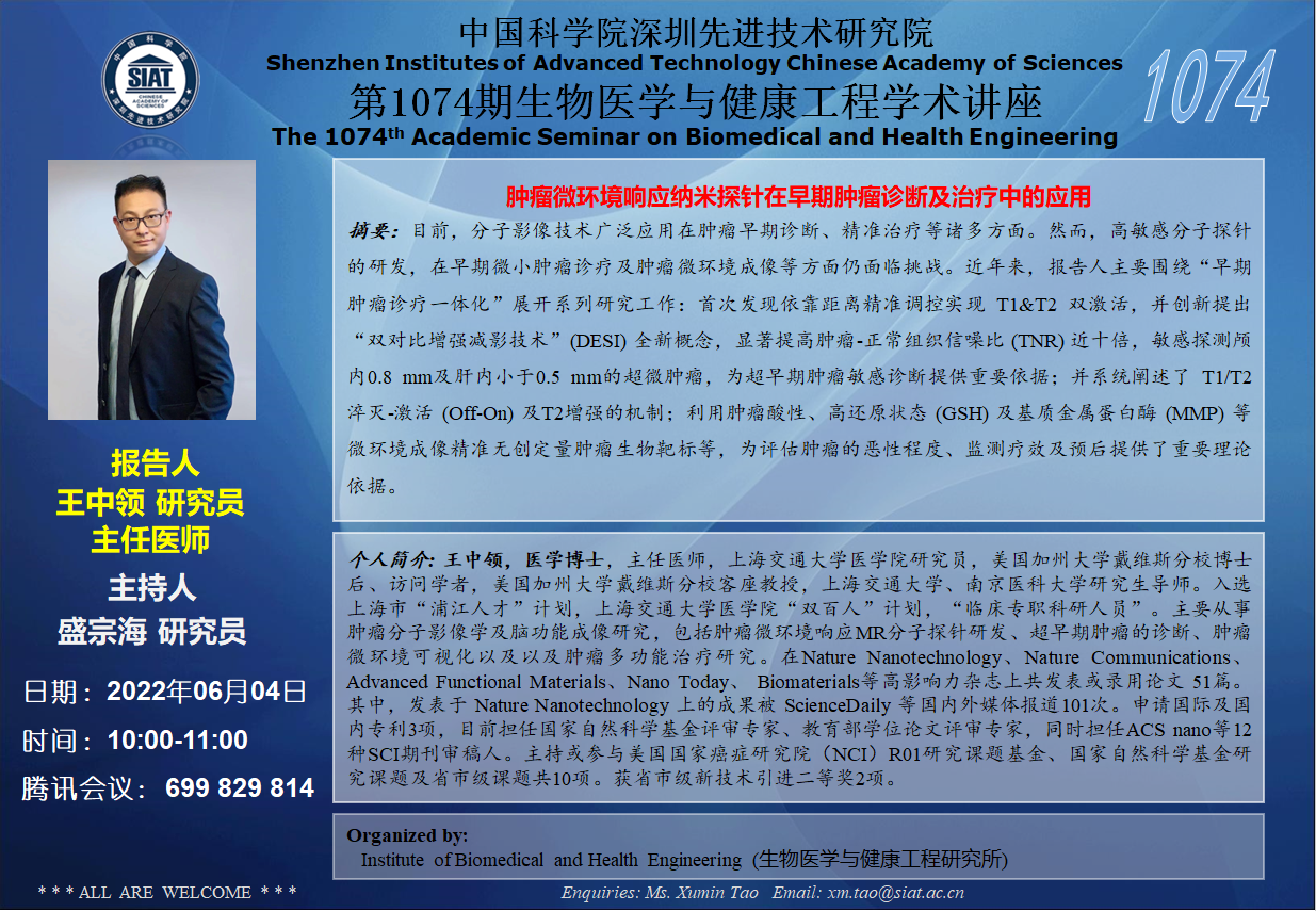 大家好!医工所将于 2022年06月04日(周六)10:00-11:00 在线上腾讯会议:699 829 814举办第1074期生物医学与健康工程学术讲座,特邀王中领,医学博士,主任医师,上海交通大学医学院研究员 作题为“肿瘤微环境响应纳米探针在早期肿瘤诊断及治疗中的应用”的学术报告。诚挚邀请大家参加学习和交流!