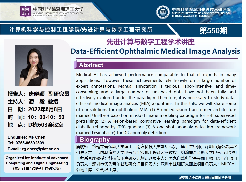 大家好!先进计算与数字工程研究所/计算机学院学术讲座第550期将于6月8日10:00-10:50在D栋603会议室举行,本次讲座将邀请南方科技大学 唐晓颖 副研究员作题为“Data-Efficient Ophthalmic Medical Image Analysis”的报告。本次报告将由计算机学院 潘毅 教授主持,诚挚邀请大家参加、学习和交流!