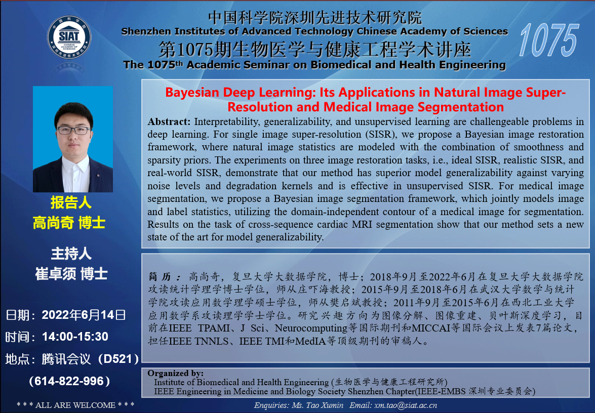 大家好!医工所将于 2022年6月14日(周二)14:00-15:30 ,在会议室D521以及线上腾讯会议:614-822-996举办第1075期生物医学与健康工程学术讲座,特邀高尚奇,复旦大学大数据学院,博士 作题为“Bayesian Deep Learning: Its Applications in Natural Image Super-Resolution and Medical Image Segmentation”的学术报告。诚挚邀请大家参加学习和交流!