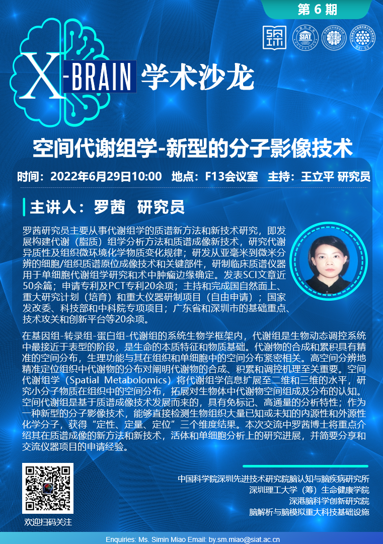 本次沙龙由医工所,罗茜研究员,带来作题为“空间代谢组学-新型的分子影像技术”的专题报告。