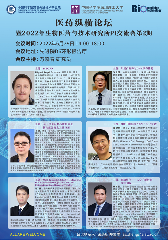 医药所医药纵横论坛暨将于2022年06月29日 星期三 14:00-16:00在先进院D6环形报告厅举行。本次讲座邀请了来自广州健康院Miguel Angel Esteban研究员、秦宝明研究员、深圳大学朱卫国教授、清华大学马岚研究员、南方科技大学许扬副教授、先进院蛋白药物中心畅君雷研究员主讲。届时,万晓春研究员将主持讲座。