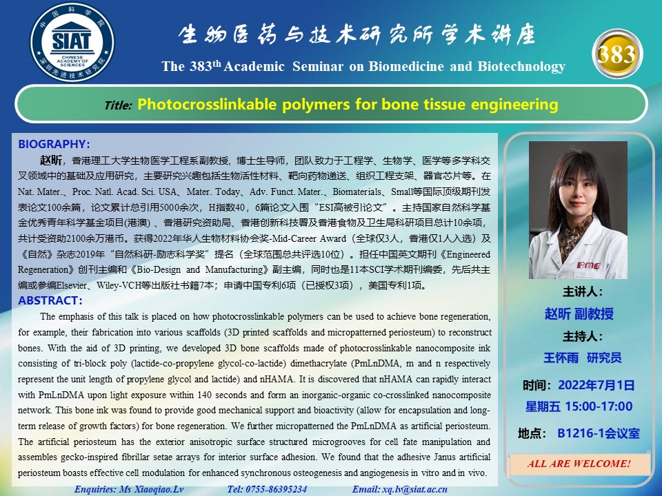 医药所第383期学术讲座将于2022年07月01日 星期五15:00-17:00在先进院 B1216-1会议室举行。本次讲座邀请了来自香港理工大学,赵昕副教授带来“Photocrosslinkable polymers for bone tissue engineering”的报告。届时,王怀雨研究员将主持讲座。