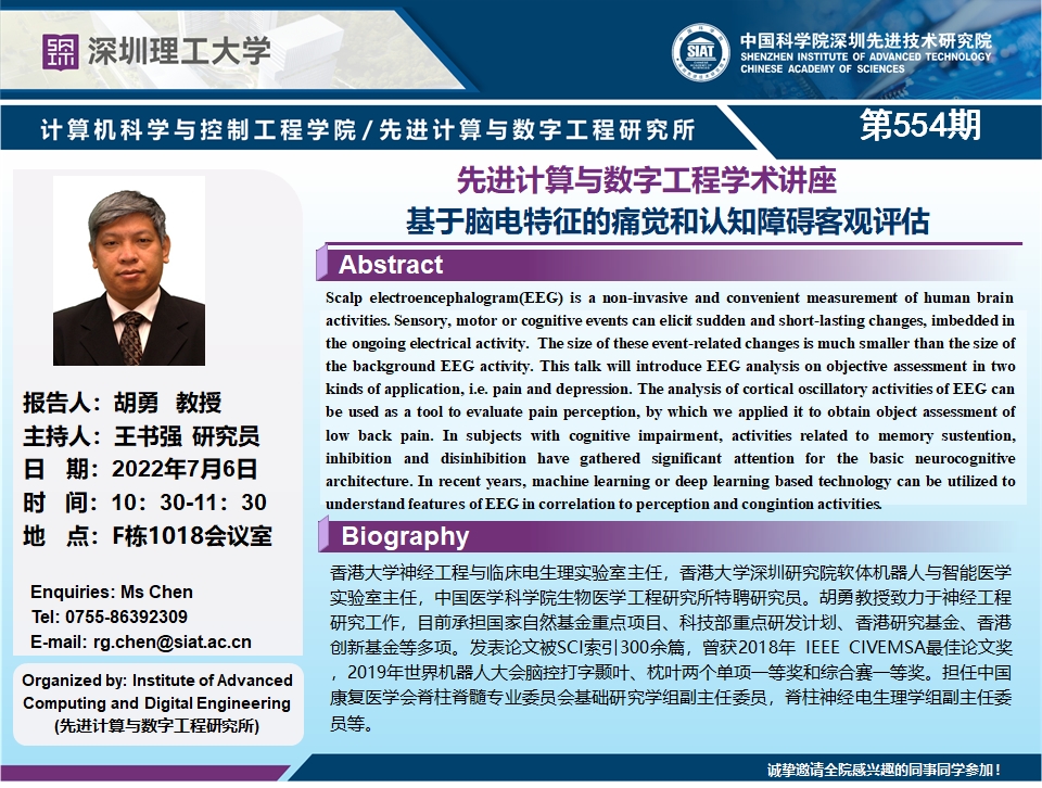 大家好!先进计算与数字工程研究所/计算机学院学术讲座第554期将于7月6日10:30-11:30在F栋1018会议室举行,本次讲座将邀请香港大学 胡勇 教授作题为“基于脑电特征的痛觉和认知障碍客观评估”的报告。本次报告将由数字所 王书强 研究员主持,诚挚邀请大家参加、学习和交流!